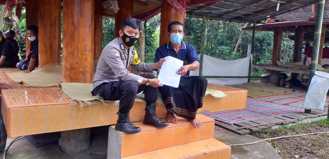 Bhabinkamtibmas menyampaikan kepada keluarga duka yang berada di lokasi rumah duka agar selalu patuh dan disiplin protokol kesehatan dengan mematuhi 5M yakni mencuci tangan, memakai masker, menjaga jarak, menghindari kerumunan dan membatasi mobilitas penduduk.