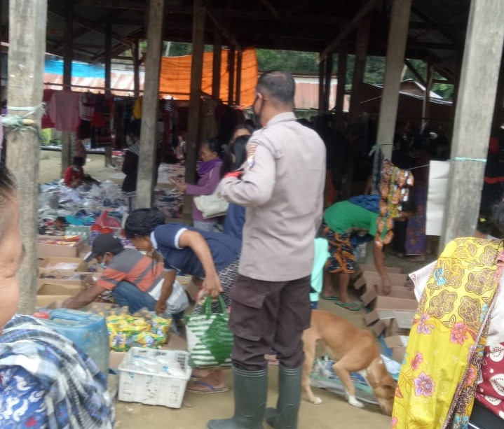 Dalam kegiatan tersebut Kapolsek Simbuang bersama anggota bhabin membubarkan kerumunan masyarakat di pasar Kondodewata dan memberikan himbauan,