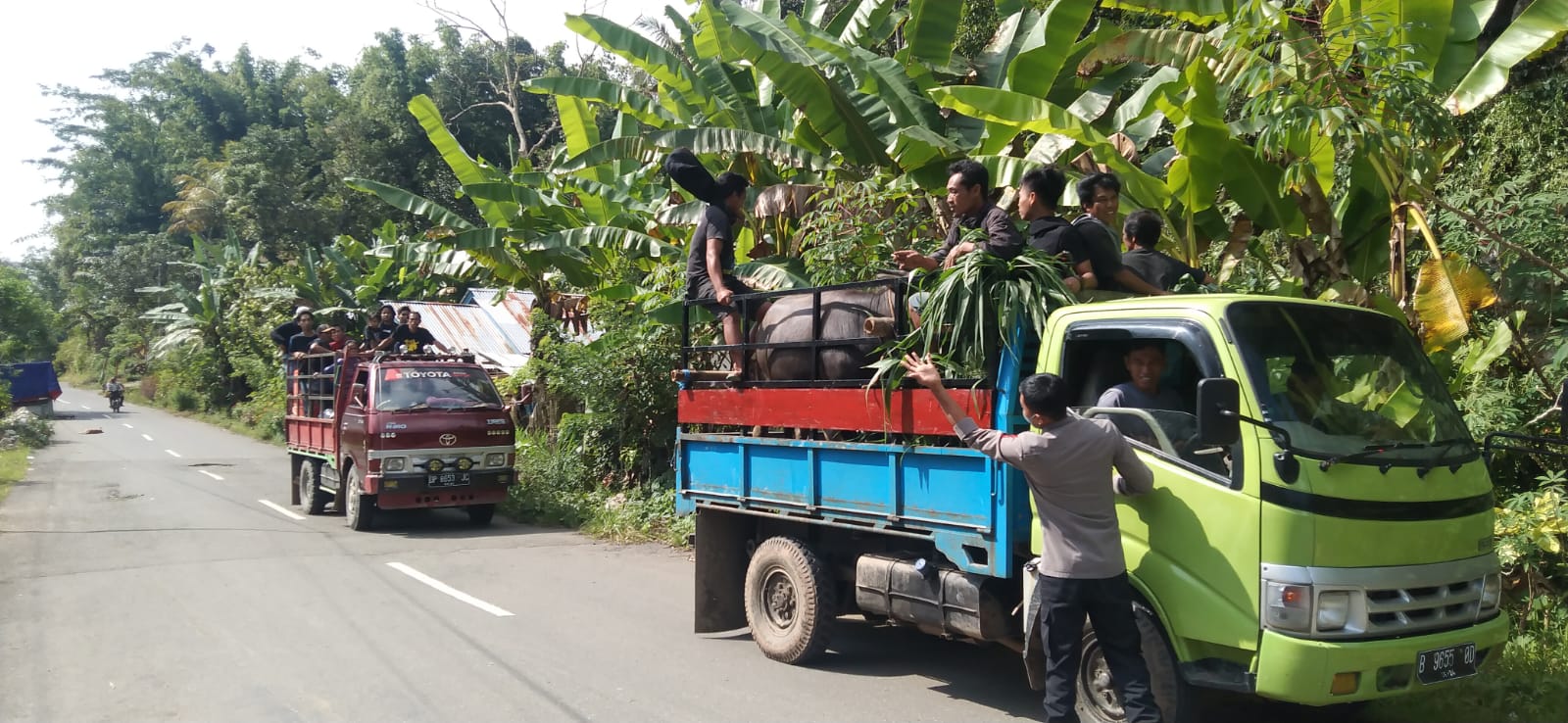Selanjutnya personil pam memberikan himbauan kepada warga yang mempunyai hewan ternak sapi, kerbau, babi dan hewan berkuku belah lainnya agar melaporkan apabila ada ternaknya yang mempunyai gejala ciri – ciri PMK agar dilakukan tindakan pencegahan.