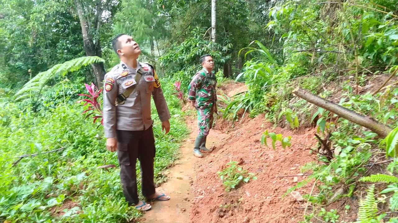 Bhabinkamtibmas Polsek Makale bersama Babinsa Koramil 01 Makale meninjau laporan masyarakat terkait Longsor