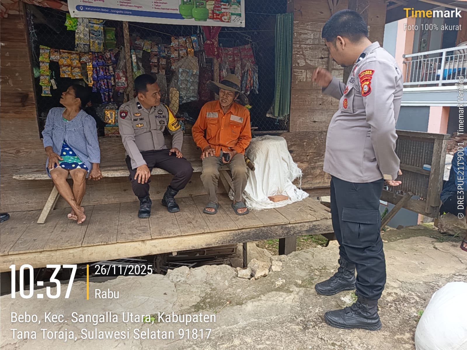 Tana Toraja — Pada Rabu, 26 November 2025 pukul 11.30 WITA, Bhabinkamtibmas Polsek Sangalla, Aipda Jimmy Simbo, S.H, melaksanakan patroli kamtibmas di wilayah Kelurahan Bebo, Kecamatan Sangalla Utara, Kabupaten Tana Toraja.