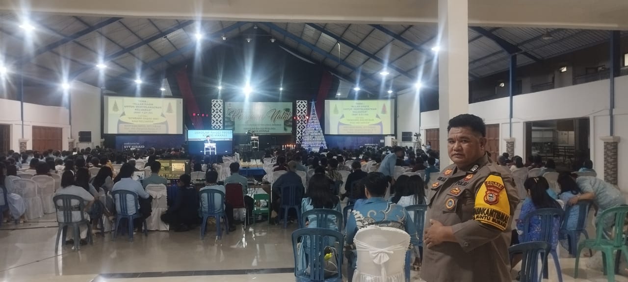 Tana Toraja – Senin, 01 Desember 2025 pukul 18.00 WITA, Bhabinkamtibmas Polsek Makale, Bripka Maupa Rajab, melaksanakan kegiatan monitoring dan pengamanan Perayaan Natal yang berlangsung di Kampus STT Kibaid Gereja Kibaid, Lingkungan Buisun, Kelurahan Buntu Burake, Kecamatan Makale, Kabupaten Tana Toraja.