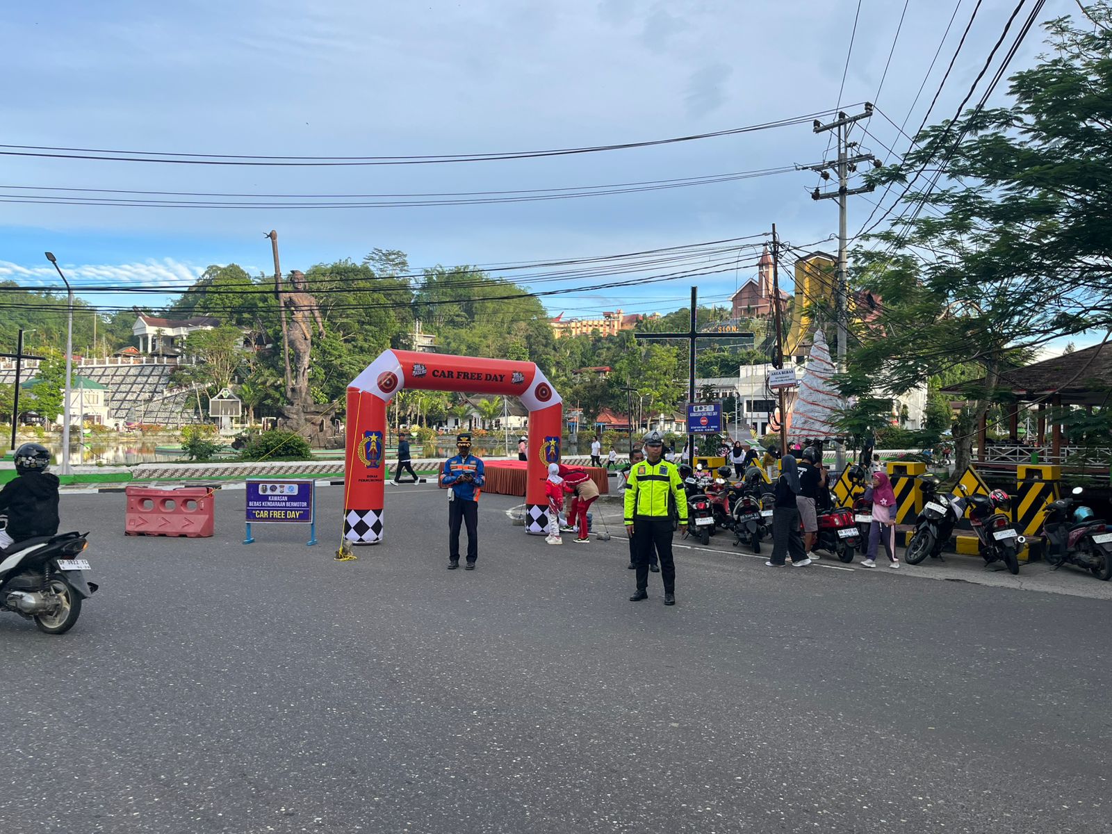 TANA TORAJA – Personel Satuan Lalu Lintas Polres Tana Toraja melaksanakan pengamanan kegiatan Car Free Day yang berlangsung di Plaza Kolam Makale, Jalan Ampera poros Tana Toraja – Toraja Utara, Sabtu sore (06/12/25).