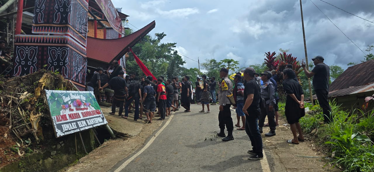 Tana Toraja – Bhabinkamtibmas Polsek Makale, Aipda Herman Pamaru, bersama Babinsa, Lurah, dan Linmas, melaksanakan monitoring dan pengamanan kegiatan adat Rambu Solo’ almarhumah Maria Salea Randabunga’ yang berlangsung di Kelurahan Ariang, Kecamatan Makale, Kabupaten Tana Toraja, pada Senin, 15 Desember 2025, mulai pukul 09.00 WITA.