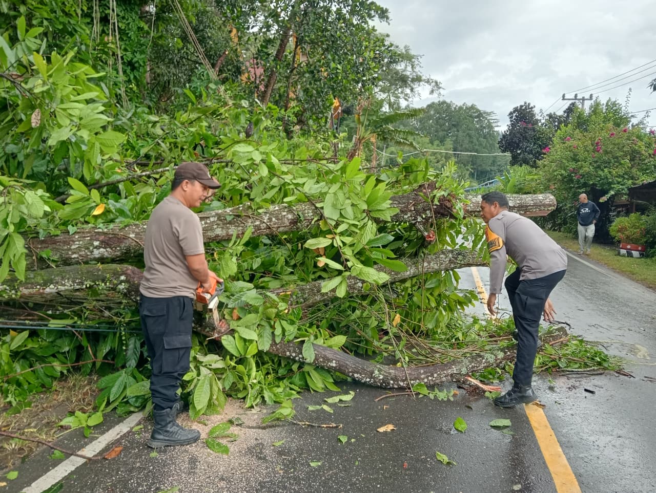Dalam penanganan di lokasi kejadian, personel Polsek Mengkendek bersama Badan Penanggulangan Bencana Daerah (BPBD) Tana Toraja melakukan pemangkasan dan pembersihan pohon tumbang jenis kayu suren.