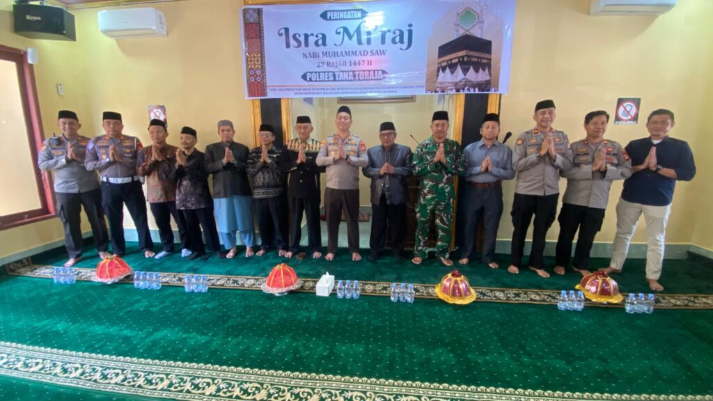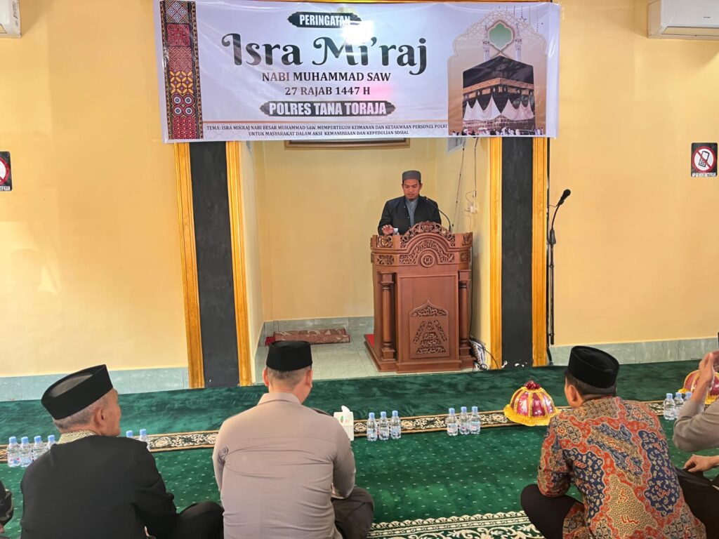 Makale, Tana Toraja – Kamis, 22 Januari 2026, pukul 08.30 WITA, Masjid Hafids Al Husain Polres Tana Toraja menjadi tempat pelaksanaan peringatan Isra Mi’raj Nabi Muhammad SAW 1447 H/2026 M. Kegiatan bertema “Isra Mikraj Nabi Besar Muhammad SAW Memperteguh Keimanan dan Ketakwaan Personel Polri untuk Masyarakat dalam Aksi Kemanusiaan dan Kepedulian Sosial” ini dipimpin langsung oleh Kapolres Tana Toraja AKBP Budi Hermawan, S.I.K.