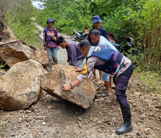 Material longsor tersebut sebelumnya menghalangi kendaraan roda empat dan roda dua melintas. Bhabinkamtibmas menghubungi pemerintah dan warga sekitar untuk melaksanakan gotong royong dengan alat seadanya. Hasilnya, jalan poros sudah dapat dilalui kembali oleh kendaraan R4 dan R2.