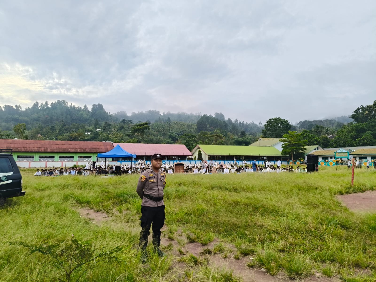Tana Toraja – Bhabinkamtibmas Polsek Mengkendek, Brigpol Silvester S. Mangguali, S.H bersama Aipda Jemi Palinggi melaksanakan pengamanan dan pengaturan arus lalu lintas pada kegiatan Sholat Id 1 Syawal 1447 Hijriah pada Jumat, 20 Maret 2026, sekitar pukul 07.30 WITA.