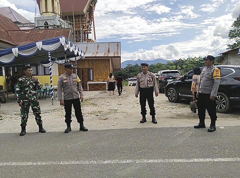 TANA TORAJA — Bhabinkamtibmas Polsek Makale, Aiptu Yosef Pasorong, melaksanakan pengamanan dan monitoring ibadah perayaan Jumat Agung di Gereja Katolik Paroki Kuasi Tritunggal Mahakudus Lapandan, Kecamatan Makale, Kabupaten Tana Toraja, Jumat (3/4/2026) sekitar pukul 15.00 Wita.
