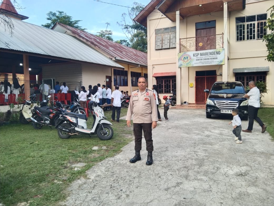TANA TORAJA — Bhabinkamtibmas Polsek Saluputti, Aipda Petrus Robong Bulaan, melaksanakan pengamanan ibadah perayaan Kamis Putih di Gereja Katolik Stasi Kokang, Paroki Santo Antonius Rembon, Kelurahan Rembon, Kecamatan Rembon, Kabupaten Tana Toraja, Kamis (2/4/2026) sekitar pukul 17.00 Wita.