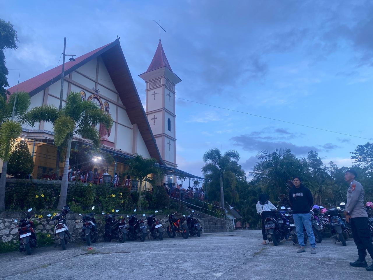 TANA TORAJA — Personel Polsek Sangalla melaksanakan pengamanan ibadah Kamis Putih dalam rangka Paskah 2026 di Gereja Katolik Paroki Kristus Imam Agung Abadi (KIAA) Sangalla, Lembang Saluallo, Kecamatan Sangalla Utara, Kabupaten Tana Toraja, Kamis (2/4/2026) sekitar pukul 17.30 Wita.